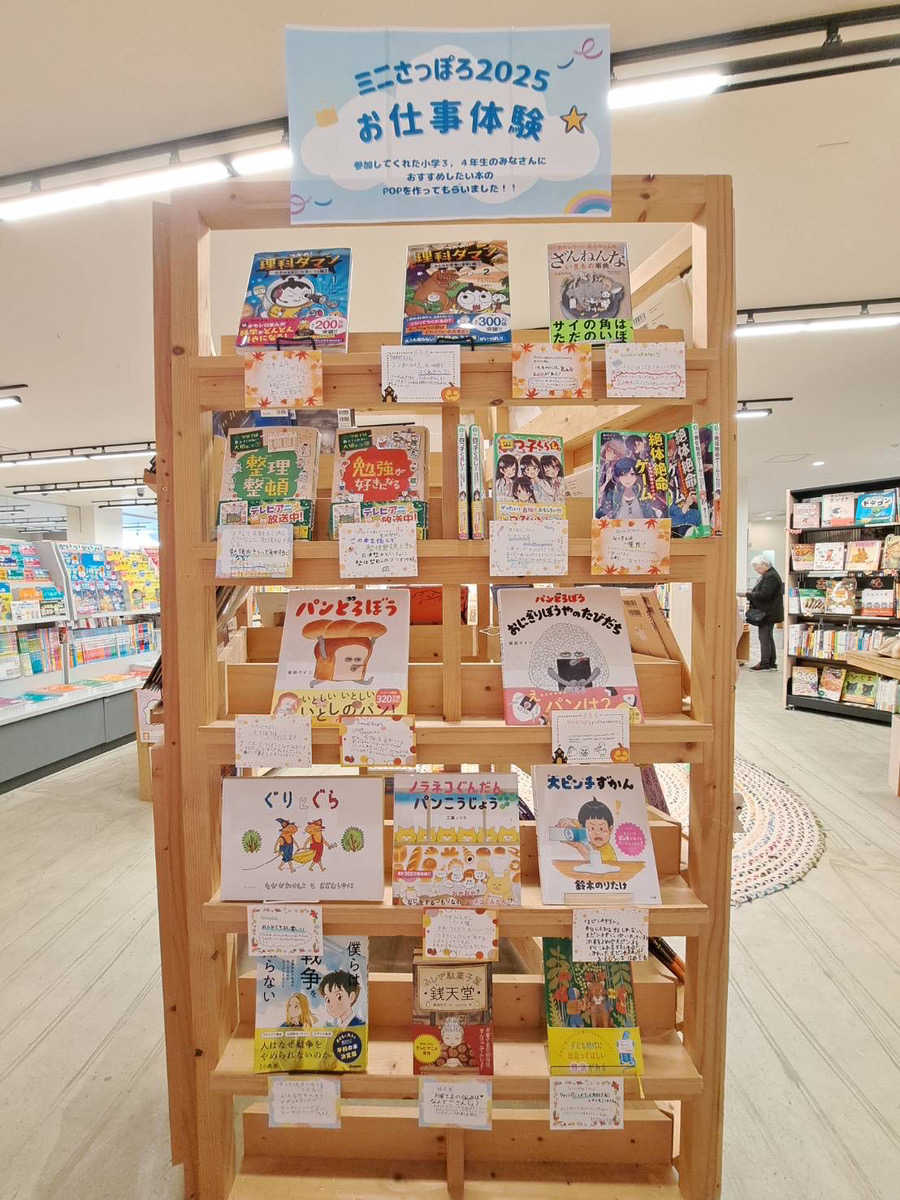 ただいまダイヤ書房本店では、アクセスサッポロで開催された札幌市主催の社会体験イベント「ミニさっぽろ2025」の会場で小学生の皆さんに作っていただいた「おすすめの本のPOP」を、特設ブースにて展示しております。