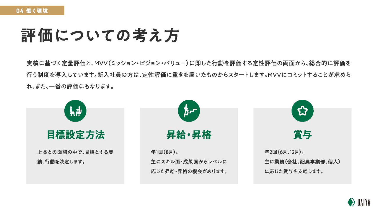 実績に基づく定量評価と、MVV(ミッション・ビジョン・バリュー)に即した行動を評価する定性評価の両面から、総合的に評価を行う制度を導入しています。